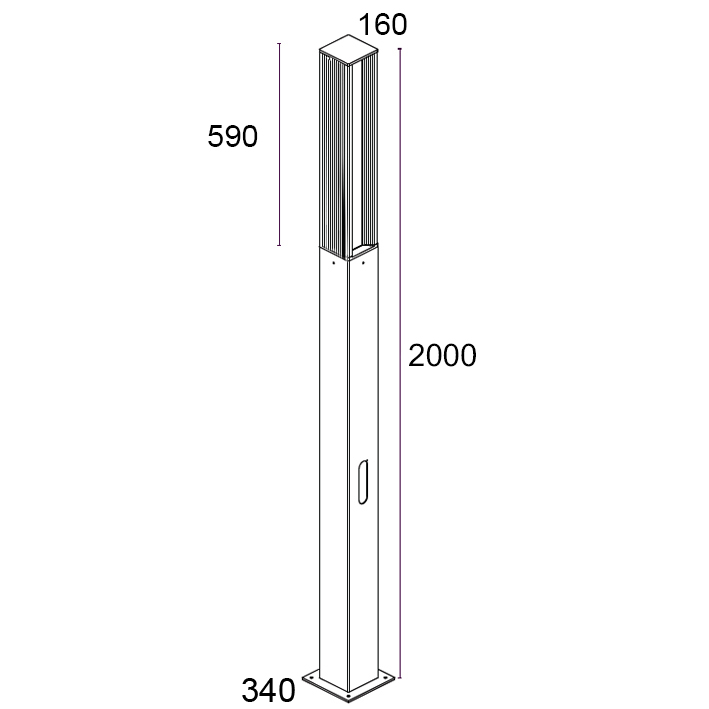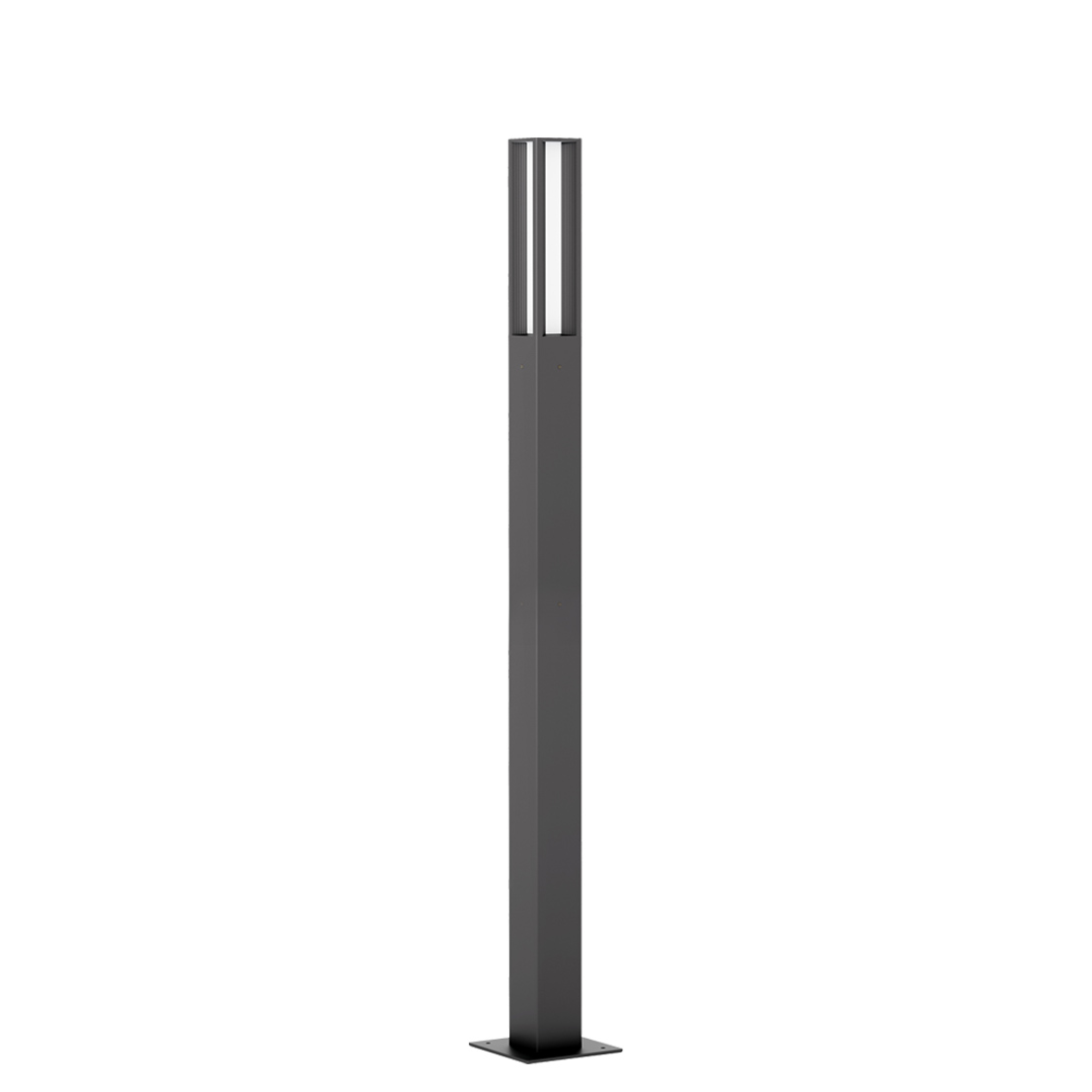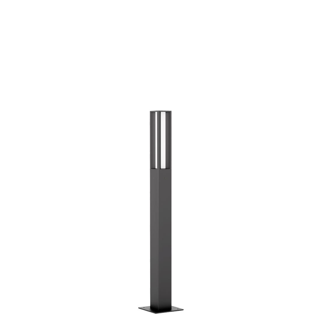 Säulenleuchte für den Bodeneinbau mit einem Diffusor mit begrenztem Querschnitt. Konfigurierbarer Lichtkoffer für 1 bis 4 Lichtpunkte in verschiedenen Höhen.