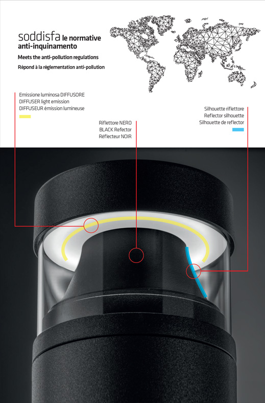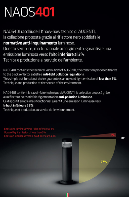 Naos has been designed to meet different residential lighting needs, ideal for paths, gardens and avenues. This pole, in fact, is available with two versions of optics: the first, with white diffuser, is designed to offer a greater illumination, more intense, while the second, with black reflector, guarantees an effective anti-glare and complies with the regulations against light pollution. Both versions are available with powers of 14W and 20W, and with 360° or 180° emission.